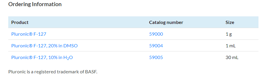 - Pluronic® F-127 is soluble in water at 10% (w/v) or in DMSO at 20% (w/v). Heating may be necessary to achieve these concentrations.