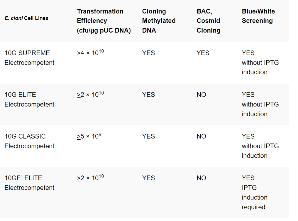 - E. cloni 10G SUPREME Electrocompetent Cells > 4 × 1010 cfu/µg pUC DNA