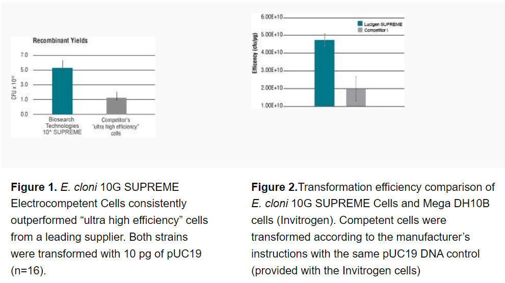 Plasmid cloning. E. cloni 10G SUPREME Cells provide recombinant yields higher than the highest efficiency cells offered by a leading supplier (Figures 1 and 2)