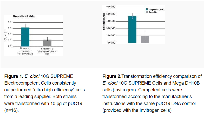 Plasmid cloning. E. cloni 10G SUPREME Cells provide recombinant yields higher than the highest efficiency cells offered by a leading supplier (Figures 1 and 2)