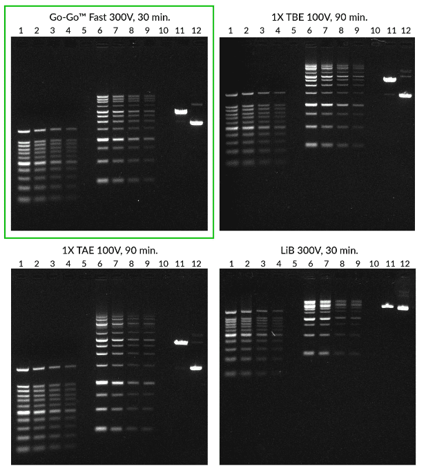 Go-Go Fast™ DNA Running Buffer allows gels to be run up to 3X faster than TBE or TAE, and shows superior DNA band resolution compared to traditional gel running buffers. DNA samples were separated on 11 cm long 1% agarose gels precast with 1X GelRed® DNA Gel Stain. Each gel was cast and run using the buffer indicated. Lanes 1-4: Biotium’s Ready-to-Use 100 bp DNA Ladder from 200 ng to 25 ng per lane. Lanes 6-9: Biotium’s Ready-to-Use 1 kb DNA Ladder from 200 ng to 25 ng per lane. Lane 11: 100 ng pUC19 plasmid (NEB) linearized with XbaI (2686 bp). Lane 12: 100 ng undigested pUC19 plasmid showing fast-migrating supercoiled plasmid. Top left: 1X Go-Go Fast™ Buffer run at 300 V (18 V/cm interelectrode distance) for 30 minutes; top right: 1X TBE buffer run at 100 V (6 V/cm) for 90 minutes; bottom left: 1X TAE buffer run at 100 V (6 V/cm) for 90 minutes; bottom right: lithium borate (LiB) buffer run at 300 V (18 V/cm) for 30 minutes.