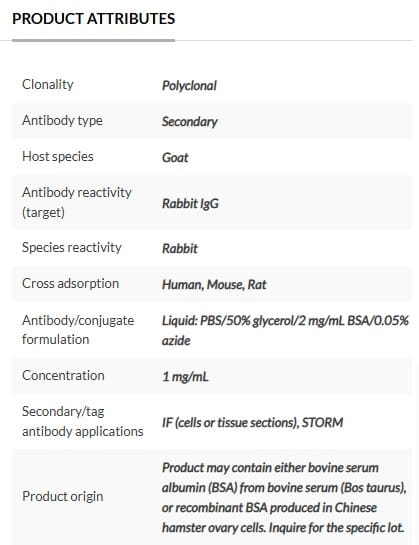 Highly cross-adsorbed goat anti-rabbit IgG (H+L) secondary antibody with single CF® Dye label for STORM super-resolution microscopy.