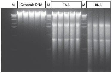 | Figure 3. DNA, RNA, and total nucleic acid (TNA) purified from diverse cell sources using the MasterPure Complete Kit. M = kb ladder. |