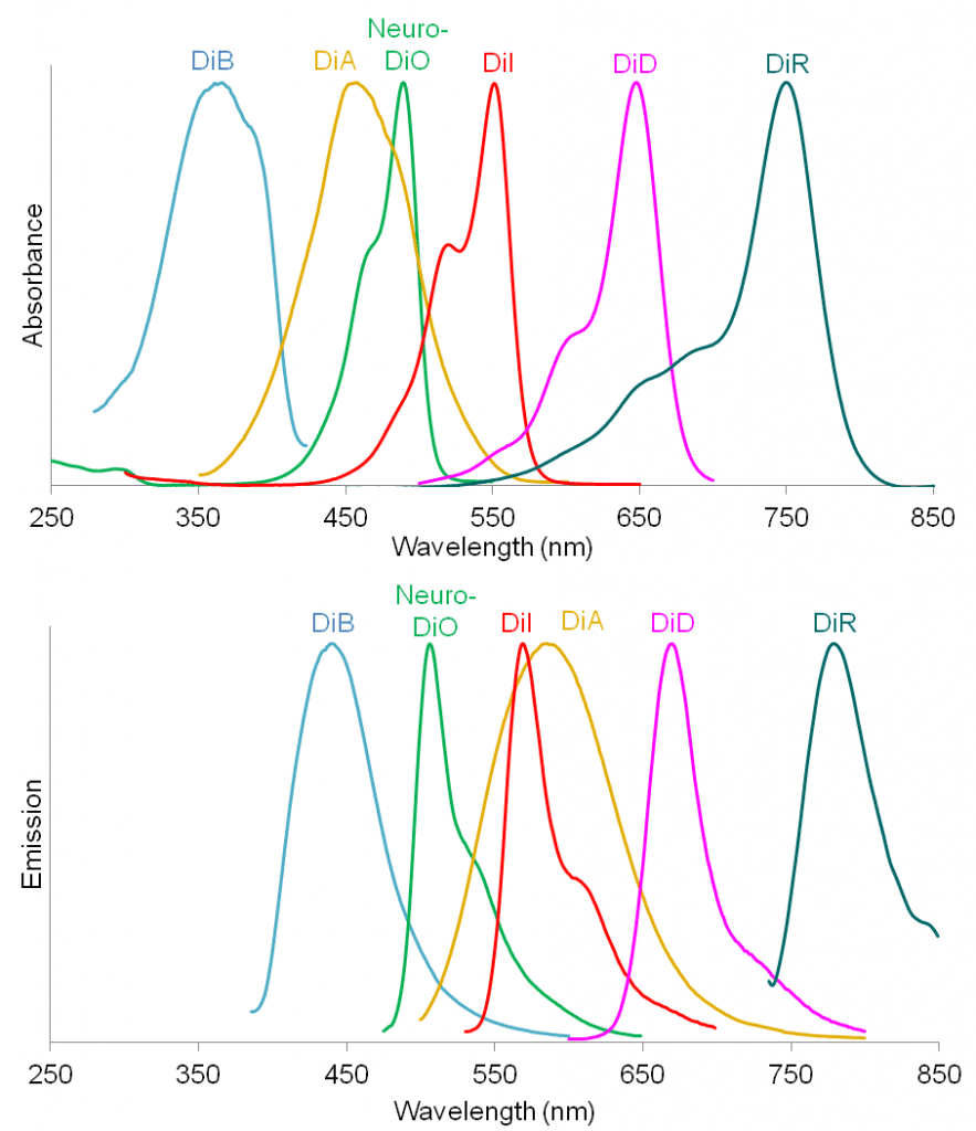 Neuro-DiI was developed at Biotium as an alternative to the widely used fluorescent membrane probe DiI. Neuro-DiI has structural features that may make the probe diffuse faster than DiI on cell membranes and also may result in a more stable labeling.