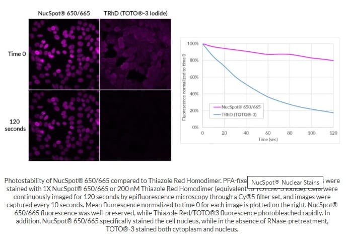 NucSpot® Nuclear Stains offer improved photostability over commonly used cyanine-based nuclear stains. The figure below shows how NucSpot® 650/665 is significantly more photostable than Thiazole Red Homodimer (TOTO® -3).