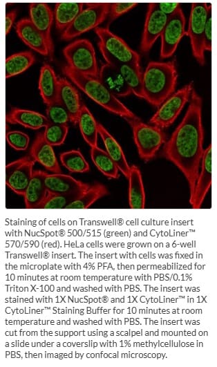NucSpot® Nuclear Stains are cell membrane-impermeant, nuclear-specific counterstains available in a variety of colors from green to near-infrared (near-IR).