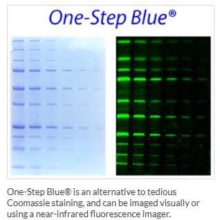 One-Step Blue® Protein Gel Stain is a ready-to-use visible blue protein gel staining solution. With no fixation or wash steps required, One-Step Blue® is a great choice for convenience and safety. One-Step Blue® can detect as little as approximately 10-20 ng of protein per band.