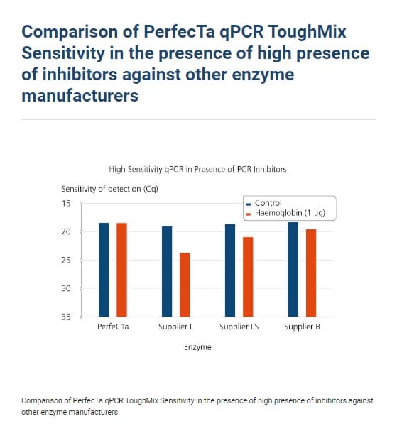 PerfeCTa qPCR ToughMix is a 2X concentrated ready-to-use reaction cocktail for PCR amplification of DNA templates that relieves several types of PCR inhibition commonly encountered with crude extracts, environmental specimens, plant tissues, animal tissues, and complex food matrices. This robust real-time qPCR reagent provides maximum sensitivity and PCR efficiency with a variety of fluorogenic probe chemistries, including TaqMan® hydrolysis probes. The only user-supplied components are primers, probe(s), and DNA template. Pre-blended with inert AccuVue plate loading dye to help minimize pipette errors during setup and provides visual confirmation of thorough mixing. A key component of PerfeCTa qPCR ToughMix is an ultra pure, highly processive thermostable DNA polymerase that is combined with high avidity monoclonal antibodies. This proprietary polymerase mix is highly resistant to PCR inhibitors and provides an extremely stringent automatic hot-start allowing reaction assembly, and temporary storage, at room temperature prior to PCR amplification. PerfeCTa qPCR ToughMix delivers exceptional performance with either fast or conventional PCR cycling protocols. UNG containing versions are blended with Uracil N-glycosylase to eliminate potential post-PCR carryover contamination associated with routine molecular testing.