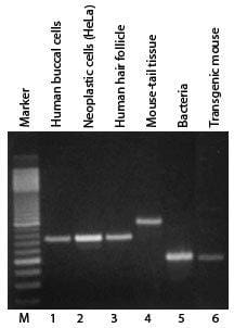 Figure 2. FailSafe™ PCR amplifications of genomic DNA extracted from a variety of tissues or cells. Buccal cells were extracted using the BuccalAmp™ DNA Extraction Kit, and all other samples with QuickExtract™ DNA Extraction Solution. PCR was performed using primers to amplify the regions indicated: Lanes 1-3, human β-globin; lane 4, transgenic mouse GAPDH; lane 5, E. coli 16S ribosomal RNA gene; lane 6, transgenic SV40 T antigen.
