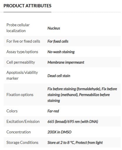 A far-red cell membrane-impermeant nuclear dye with greater nuclear specificity than Draq7™. Ideal for fixed cell nuclear counterstaining with minimal cytoplasmic RNA staining.