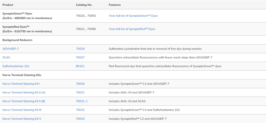 | SynaptoRed™ C2 (Equivalent to FM®4-64) | Generally 1-2 weeks from receipt of order | Biotium | Log in for pricing |