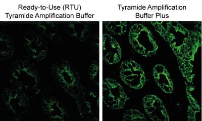 Tyramide Amplification Buffer Plus is an optimized buffer with enhanced sensitivity for tyramide signal amplification of immunostaining in cells or tissue sections. It provides significantly improved brightness, specificity, and sensitivity compared to our original Ready-to-Use Tyramide Amplification Buffer (22027).