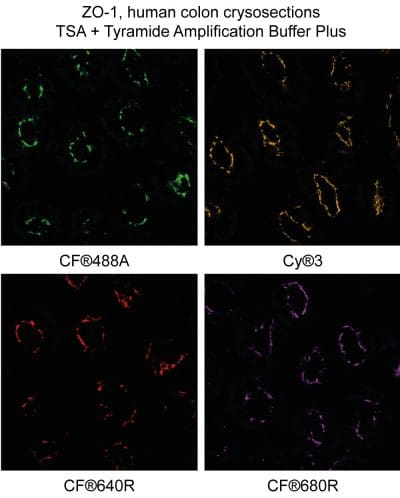 Tyramide Amplification Buffer Plus was developed as a new and improved version of our original Ready-to-Use Tyramide Amplification Buffer (22027). It is also a component in all of our Tyramide Amplification Kits. To learn more about tyramide signal amplification, including our Tyramide Amplification Kits with a selection of bright and photostable CF® dyes, see the Tyramide Amplification Technology Page.