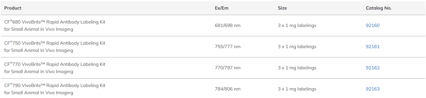 Kits for labelling & purification of near-IR antibody conjugates for small animal in vivo imaging, featuring Biotium’s industry-leading near-IR CF® Dyes.